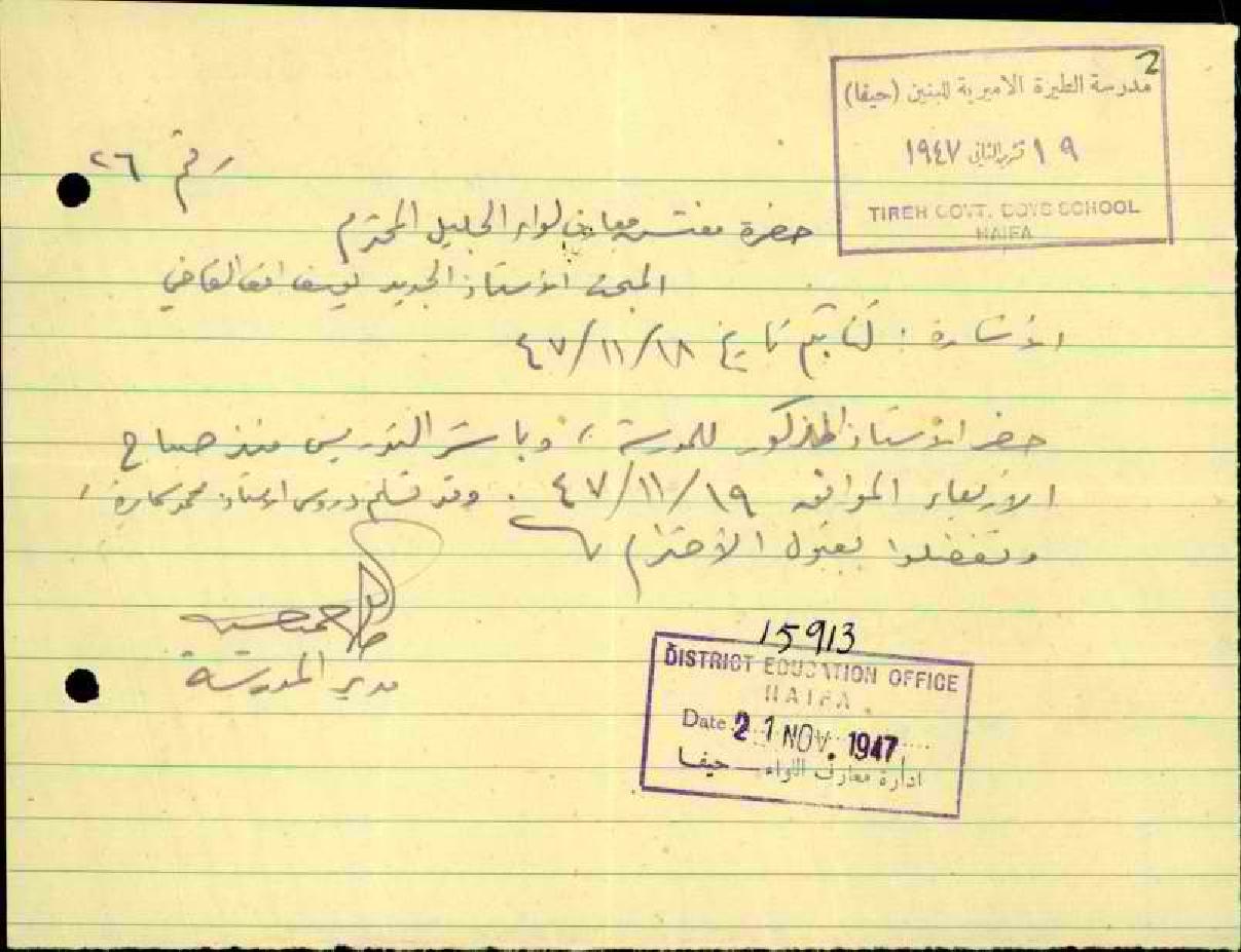 رسالة من مدير مدرسة الطيرة الأميرية للبنين الى مفتش المعارف يخبره بمباشرة المعلم يوسف القاضي عمله