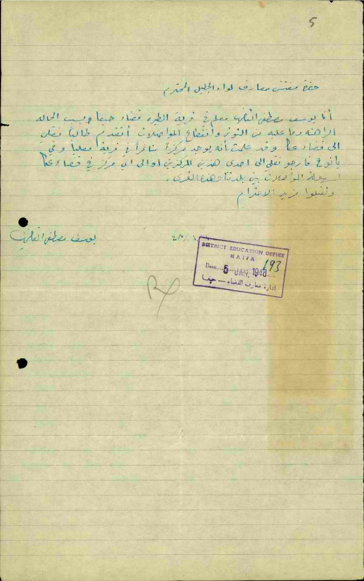 رسالة من المعلم يوسف القاضي الى مفتش المعارف يطلب نقله الى عكا