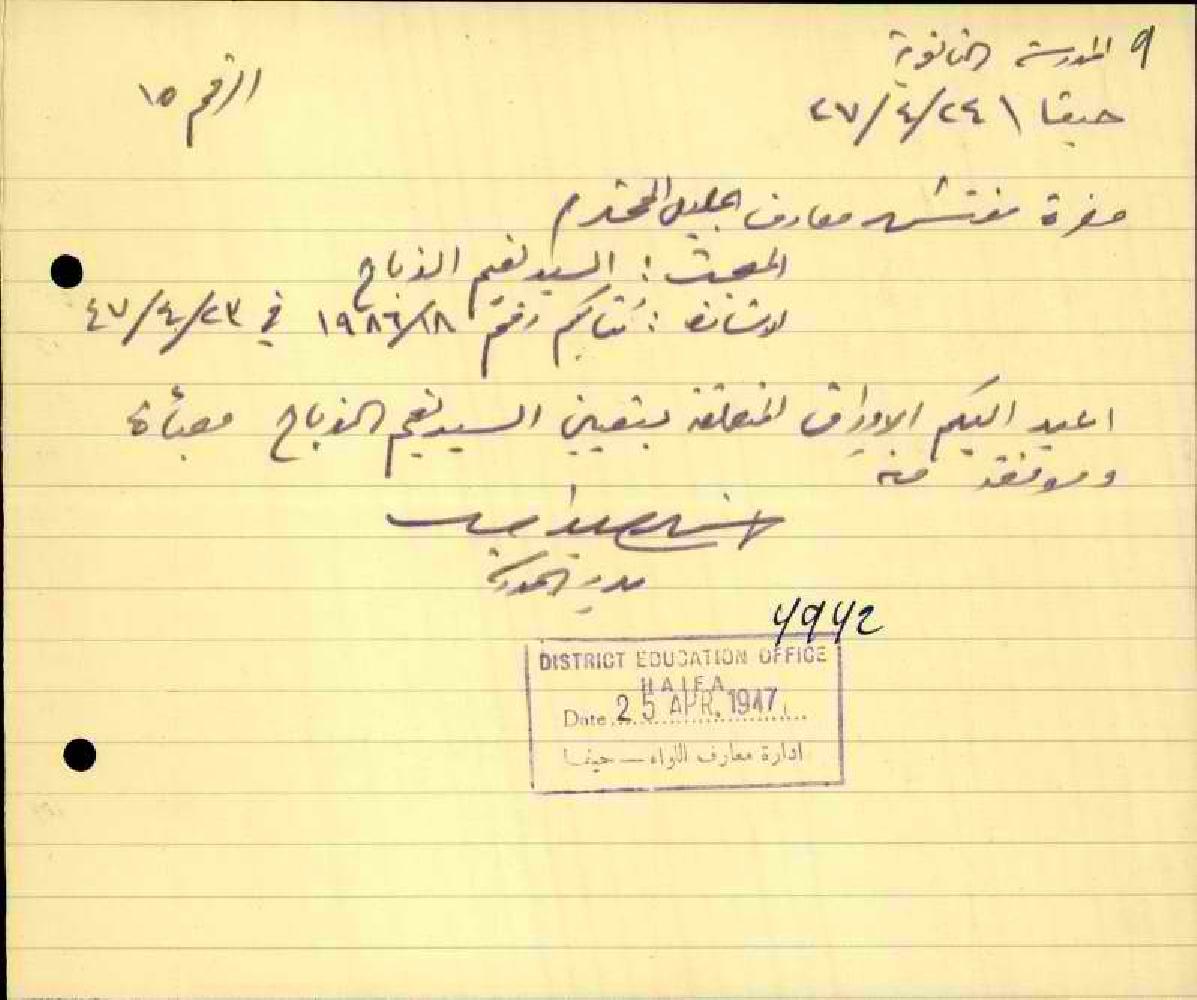 رسالة من مدير مدرسة حيفا الى مفتش المعارف مرفقة بأوراق تعيين المعلم نعيم دباح
