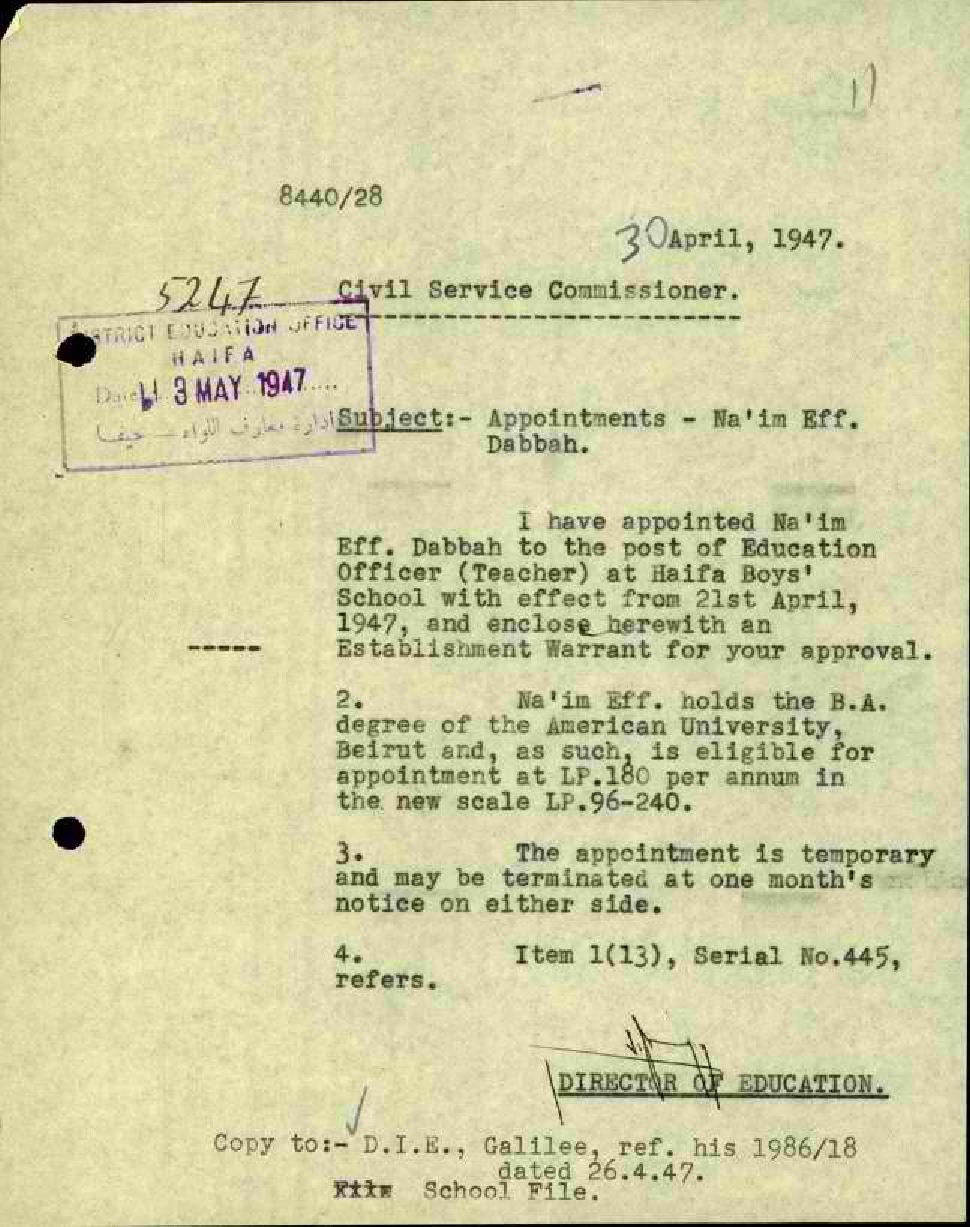 رسالة من مدير المعارف الى مفوض الخدمة المدنية بخصوص تعيين المعلم نعيم دباح في مدرسة حيفا الثانوية
