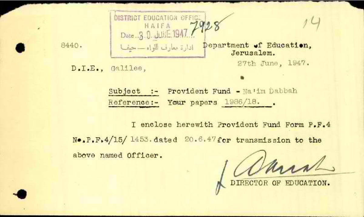 رسالة من مدير المعارف الى مفتش المعارف بخصوص اشتراك المعلم نعيم دباح في صندوق الاحتياط