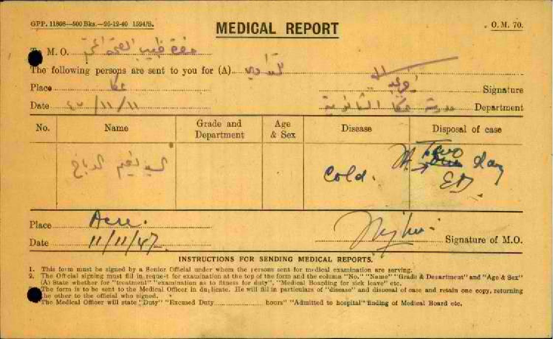 رسالة من مدير مدرسة عكا الى مفتش المعارف بخصوص تغيب المعلم نعيم دباح مرفقة بالتقرير الطبي وعودته للعمل
