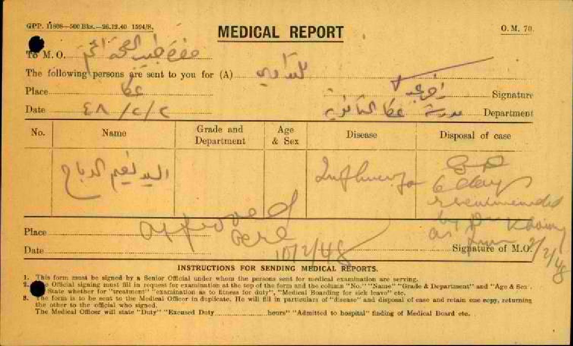 رسالة من مدير مدرسة عكا الى مفتش المعارف بخصوص تغيب المعلم نعيم دباح مرفقة بالتقرير الطبي وعودته للعمل