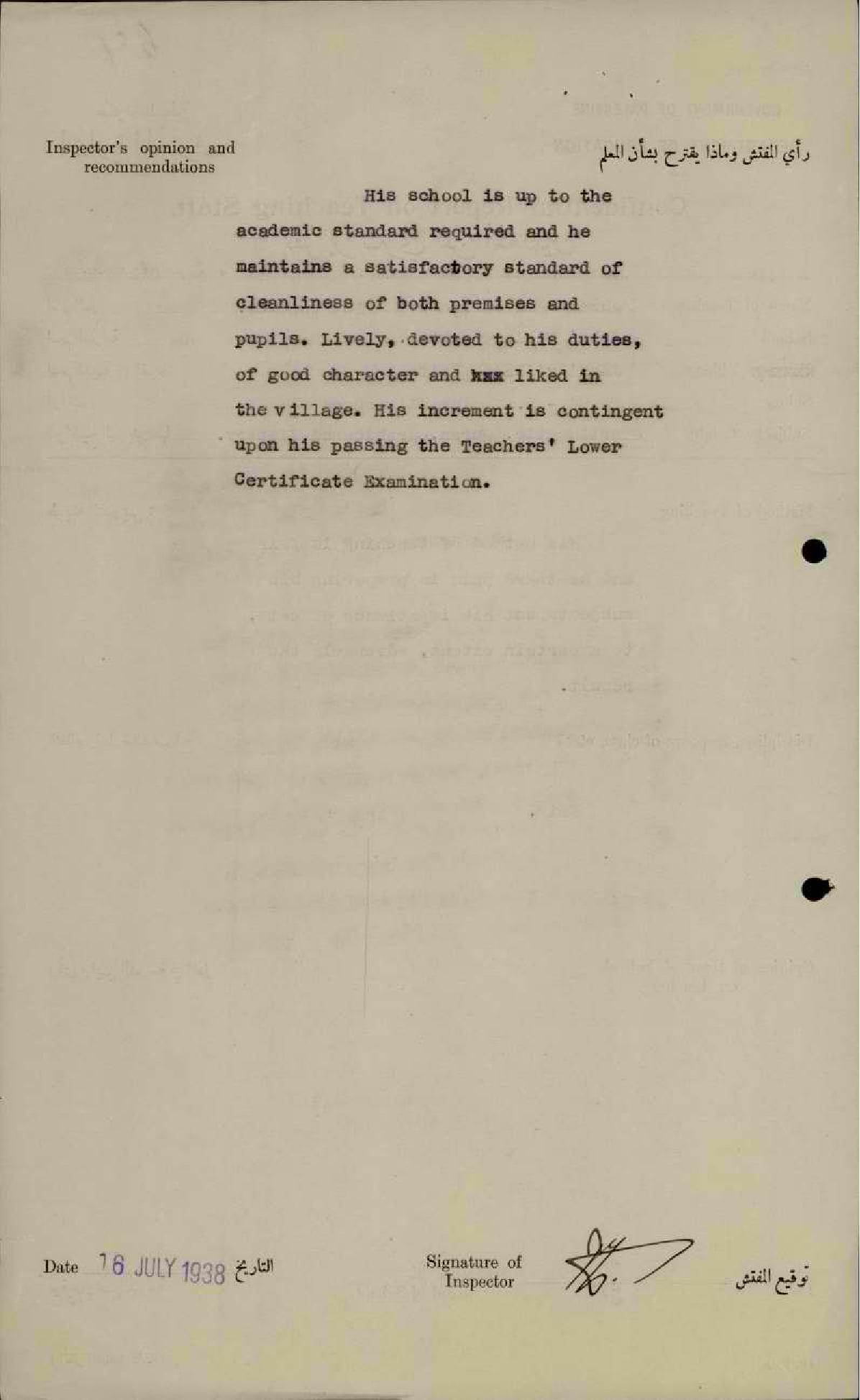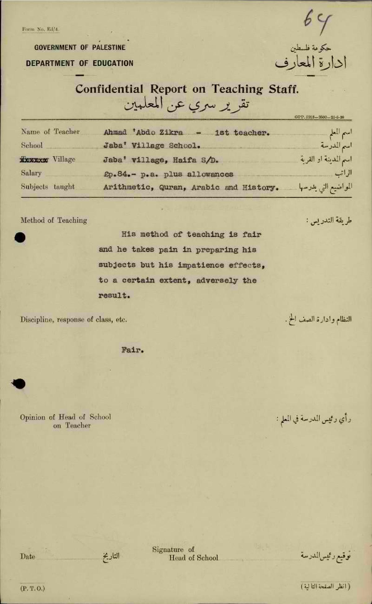 تقرير تفصيلي عن أداء المعلم أحمد ذكرى في مدرسة جبع سنة 1938