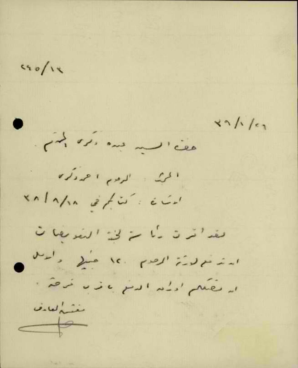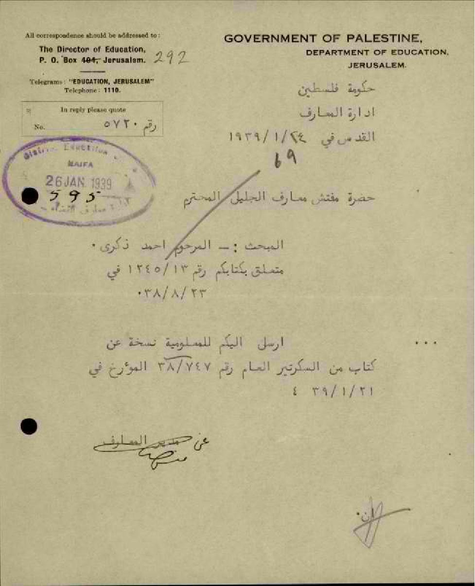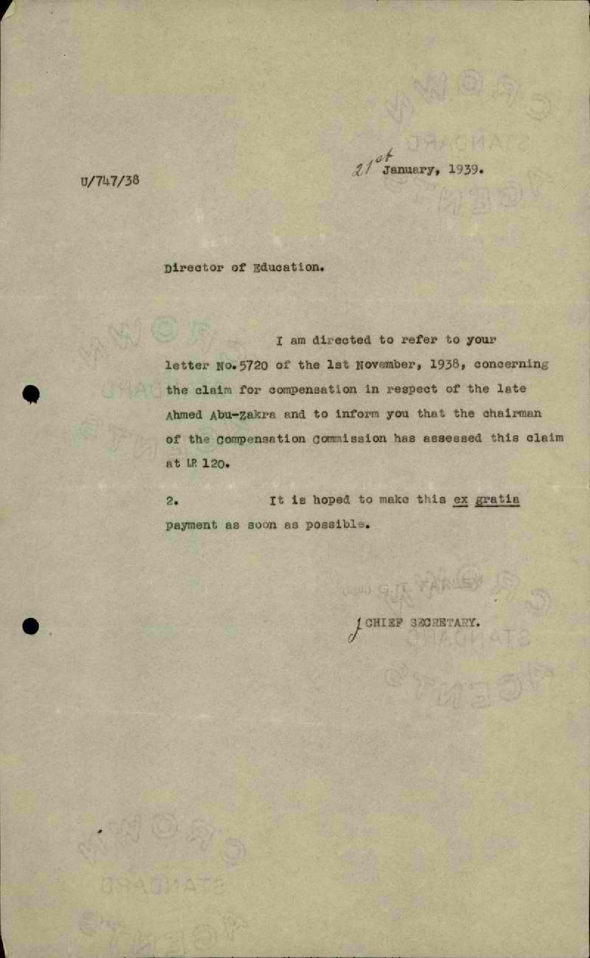 رسائل من مفتش المعارف إلى والد المعلم أحمد ذكرى يخبره بقرار رئاسة لجنة التعويضات أن تدفع لورثة المرحوم أحمد ذكرى 120 جنيهاً