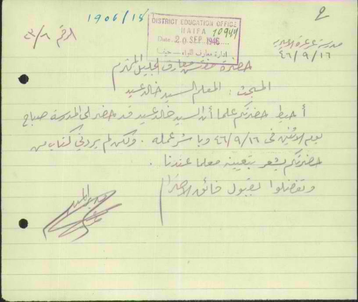 رسالة من مدير مدرسة عرعرة الى مفتش المعارف يعلمه بأن المعلم خالد عيد قد باشر عمله