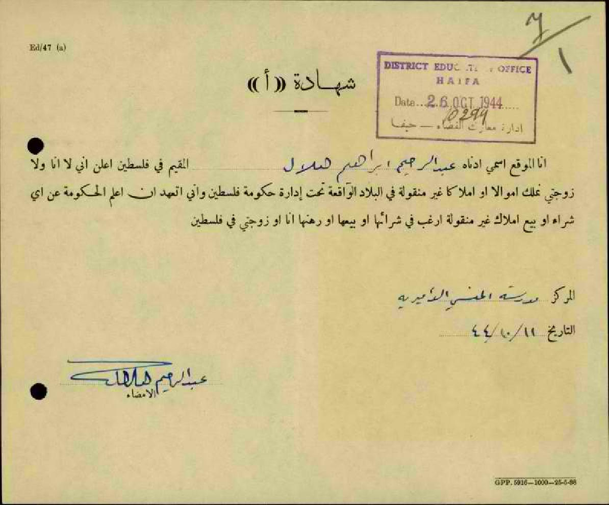 شهادة نفي ملكية-عبد الرحيم هلال/قلقيلية