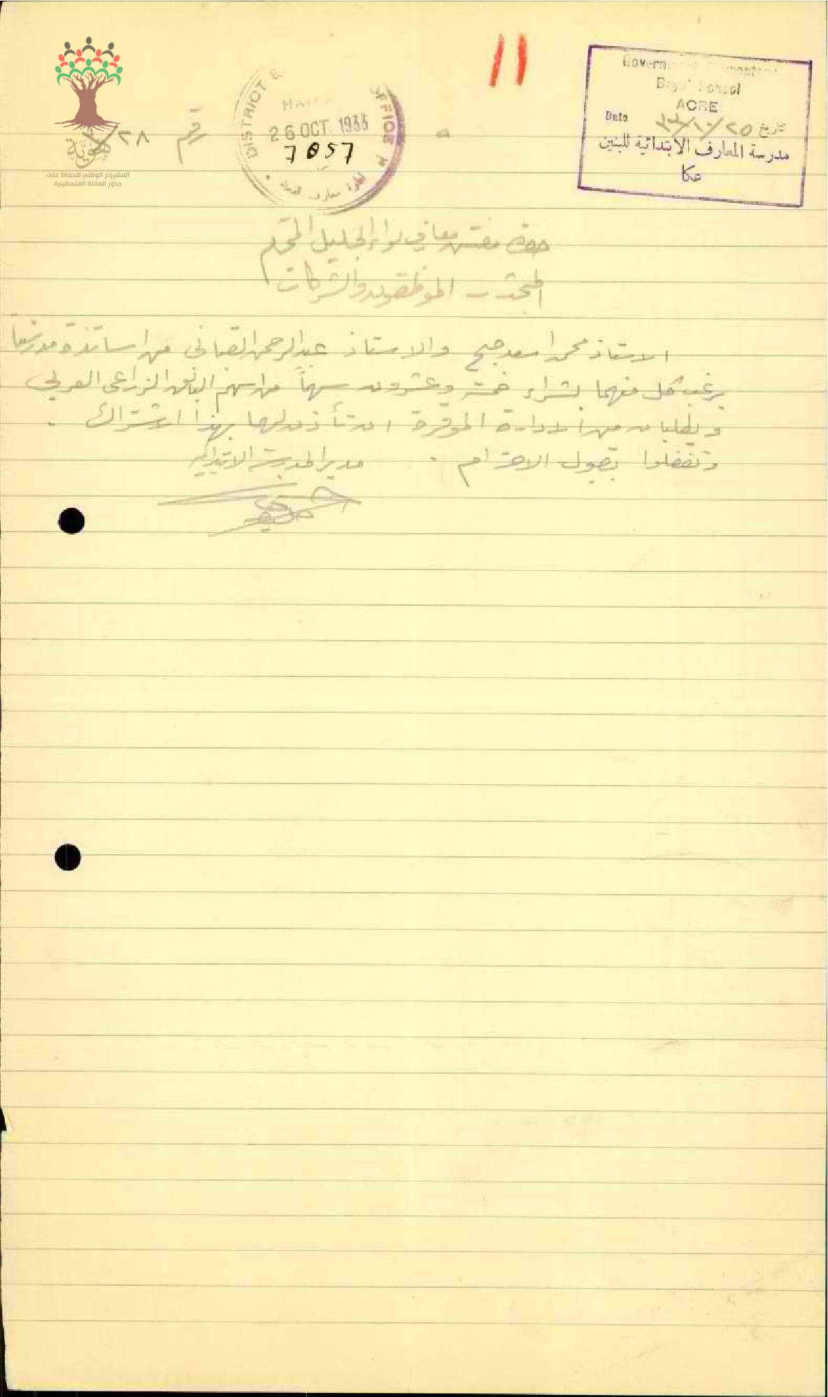 رسالة من مدير مدرسة عكا إلى مفتش المعارف يبحث معه أمر رغبة المعلم عبد الرحمن قباني بشراء أسهم من أسهم البنك الزراعي العربي