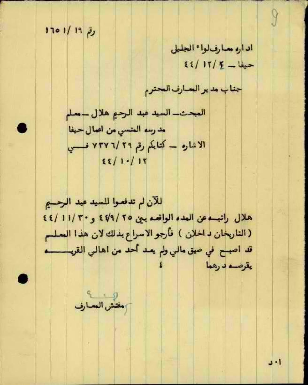 رسالة من مفتش المعارف الى مدير المعارف بخصوص تأخر راتب المعلم عبد الرحيم هلال