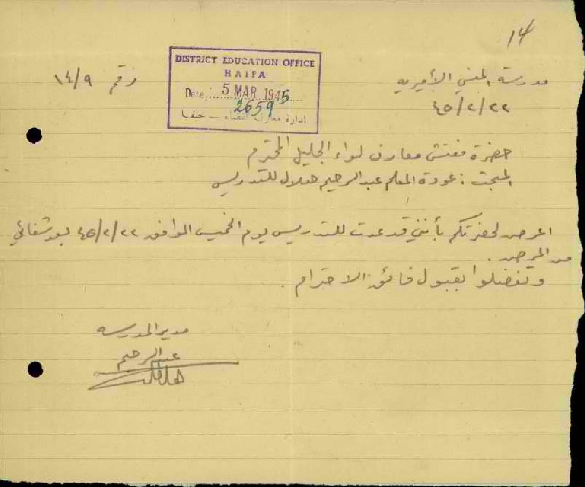 رسالة من المعلم عبد الرحيم هلال الى مفتش المعارف بخصوص عودته الى العمل
