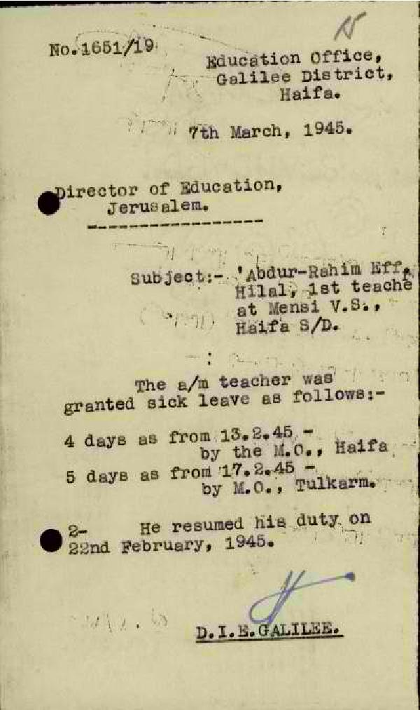 رسالة من مفتش المعارف الى مدير المعارف بخصوص اجازة مرضية للمعلم عبد الرحيم هلال وعودته للعمل