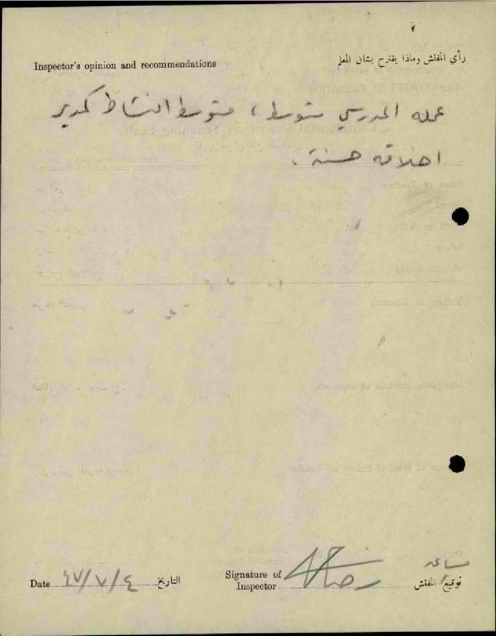 تقرير تفصيلي عن أداء المعلم عبد الرحيم هلال في مدرسة المنسي سنة 1947