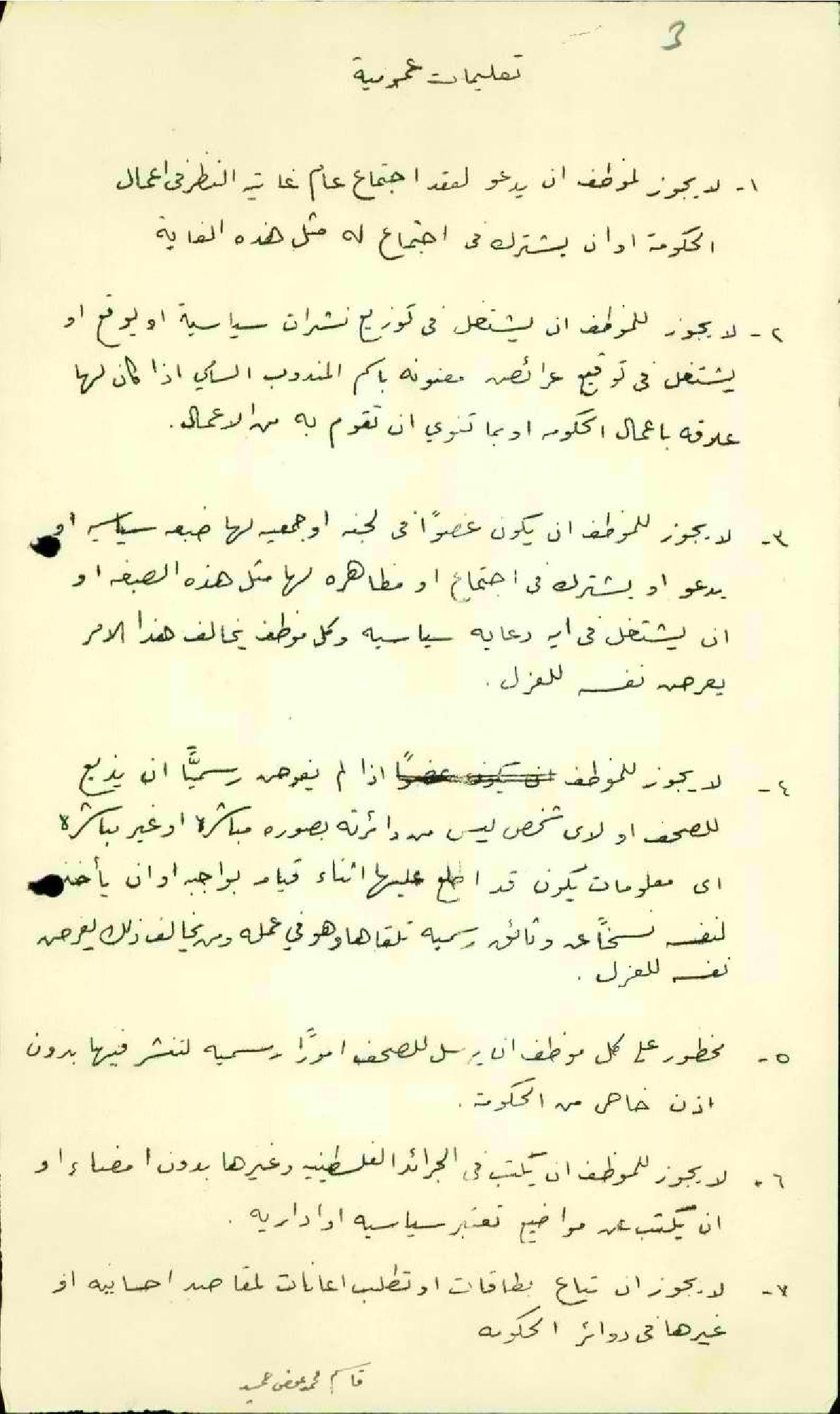 توقيع المعلم قاسم حميد على التعليمات العمومية لإدارة المعارف