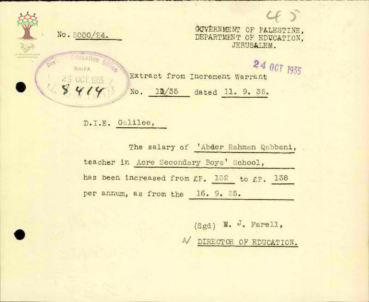 رسالة من مفتش المعارف إلى المعلم عبد الرحمن قباني يخبره بقرار زيادة راتبه السنوي