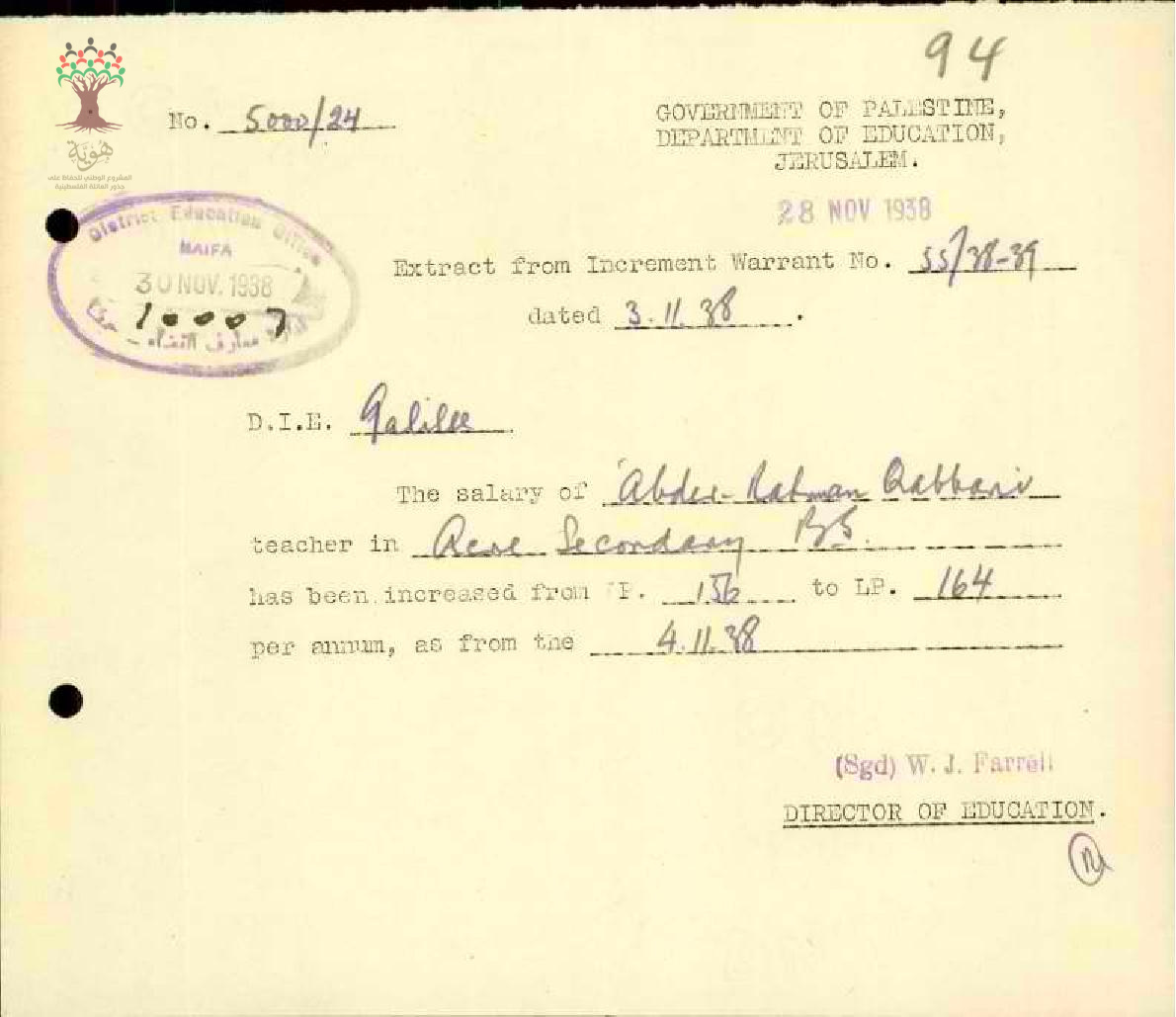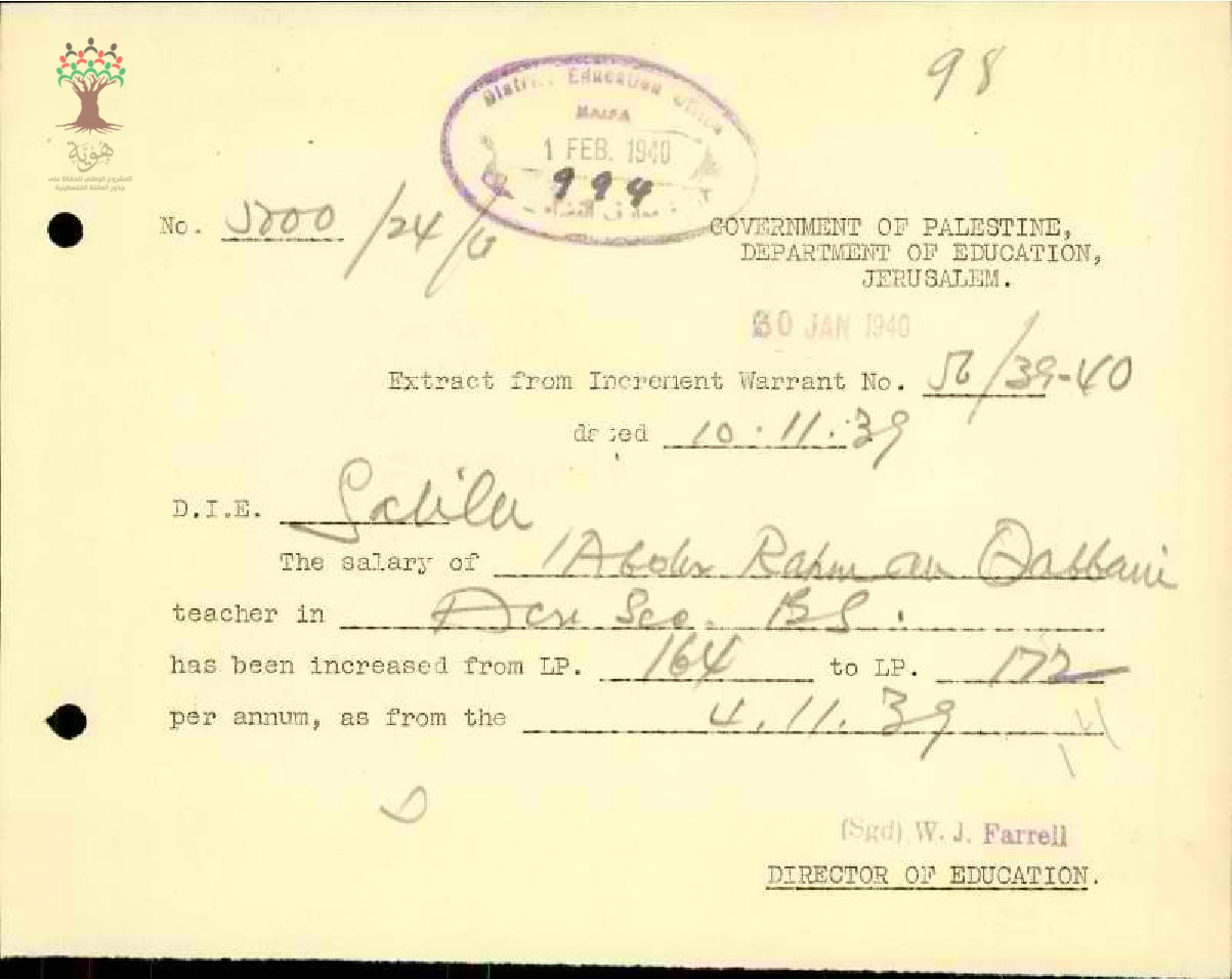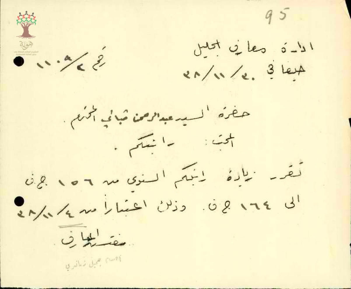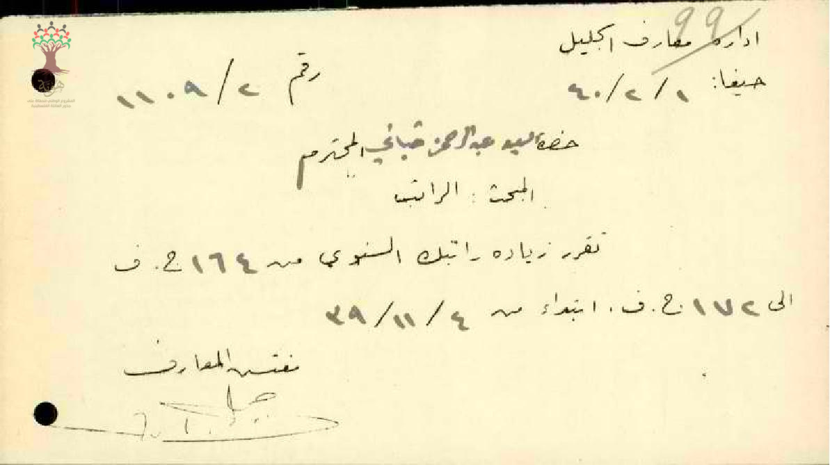 رسالة من مفتش المعارف إلى المعلم عبد الرحمن قباني يخبره بقرار زيادة راتبه السنوي