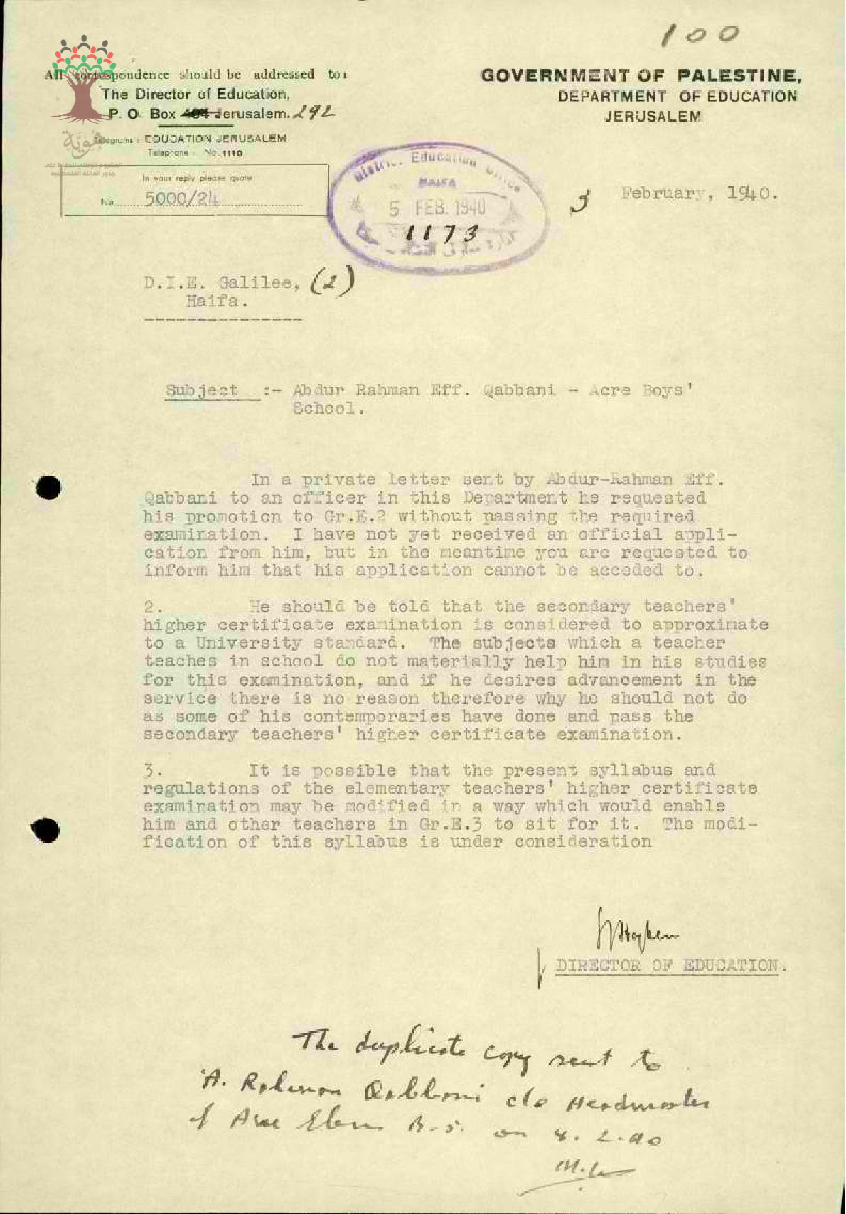 رسالة من مدير المعارف إلى مفتش المعارف يبحث معه رسالة المعلم عبد الرحمن قباني بخصوص طلب الترقية