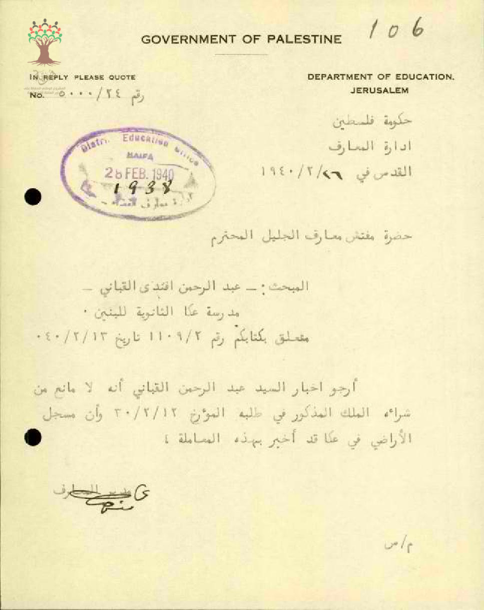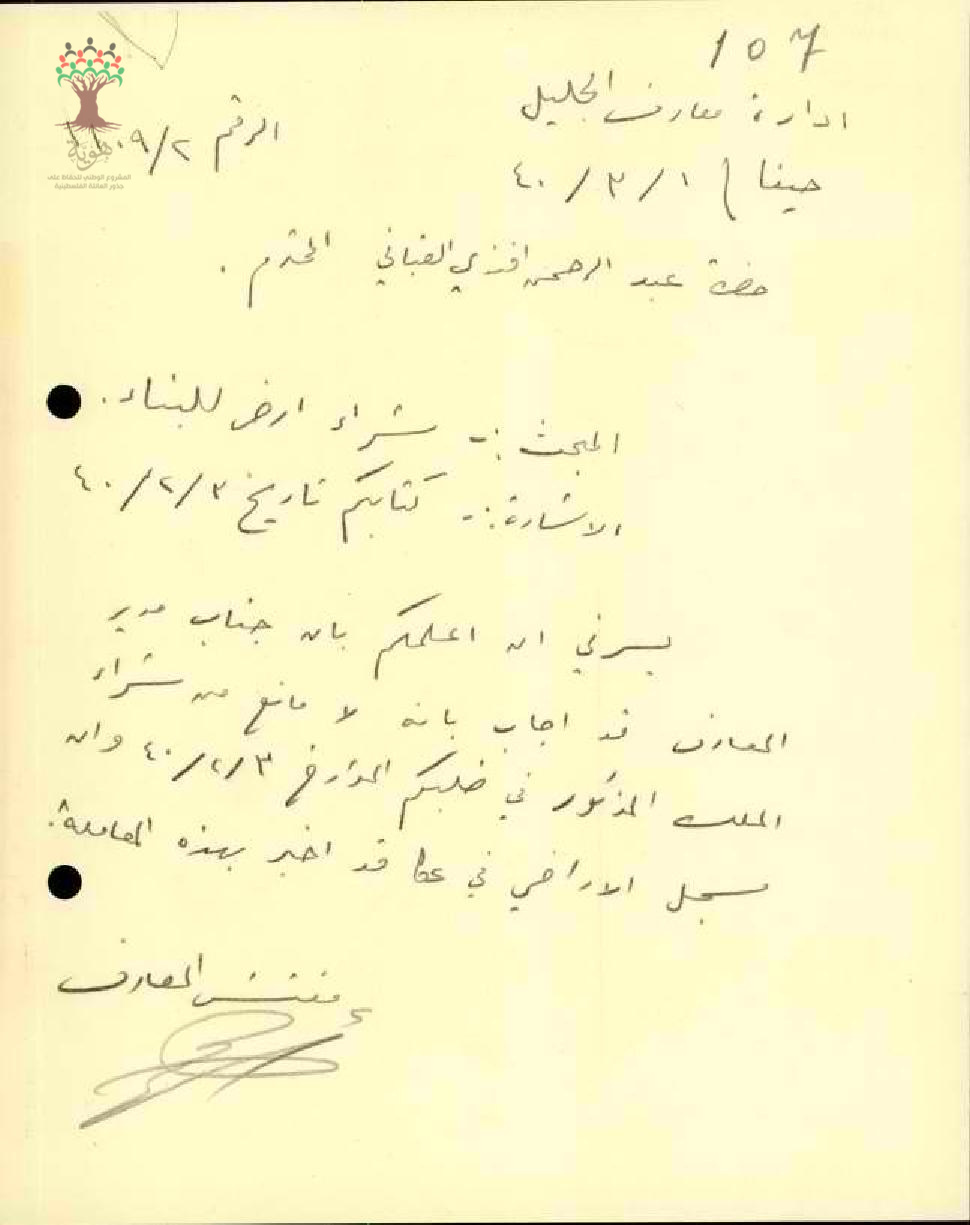 رسالة من مدير المعارف إلى مفتش المعارف يخبره بموافقة الإدارة على شراء المعلم عبد الرحمن قباني الملك المذكور