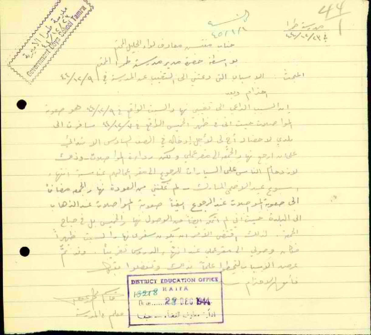 رسالة من المعلم قاسم حميد الى مفتش المعارف يشرح فيها أسباب تغيبه