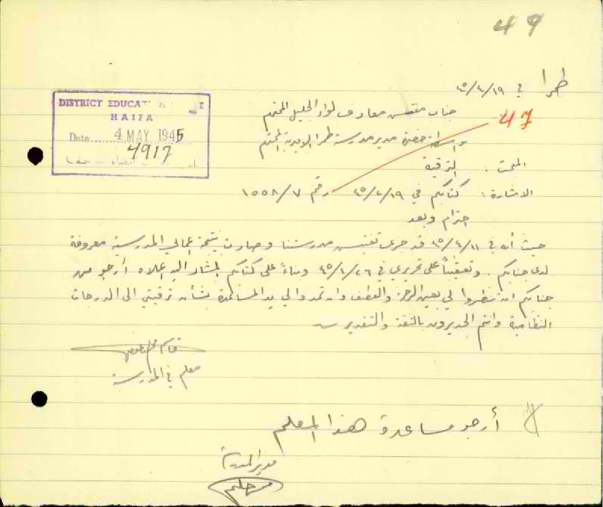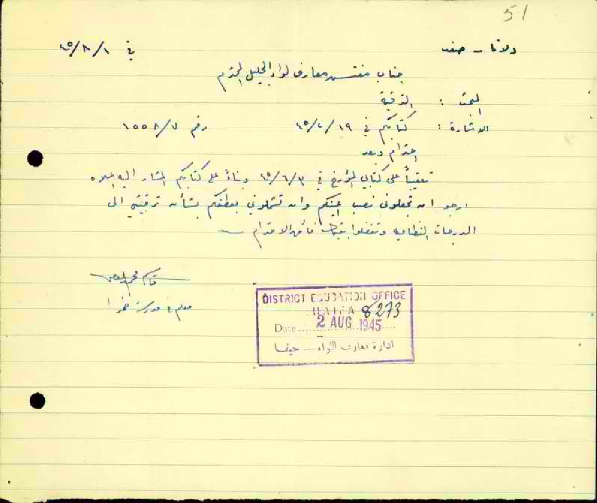 رسائل من المعلم قاسم حميد الى مفتش المعارف يطلب فيها ترقيته