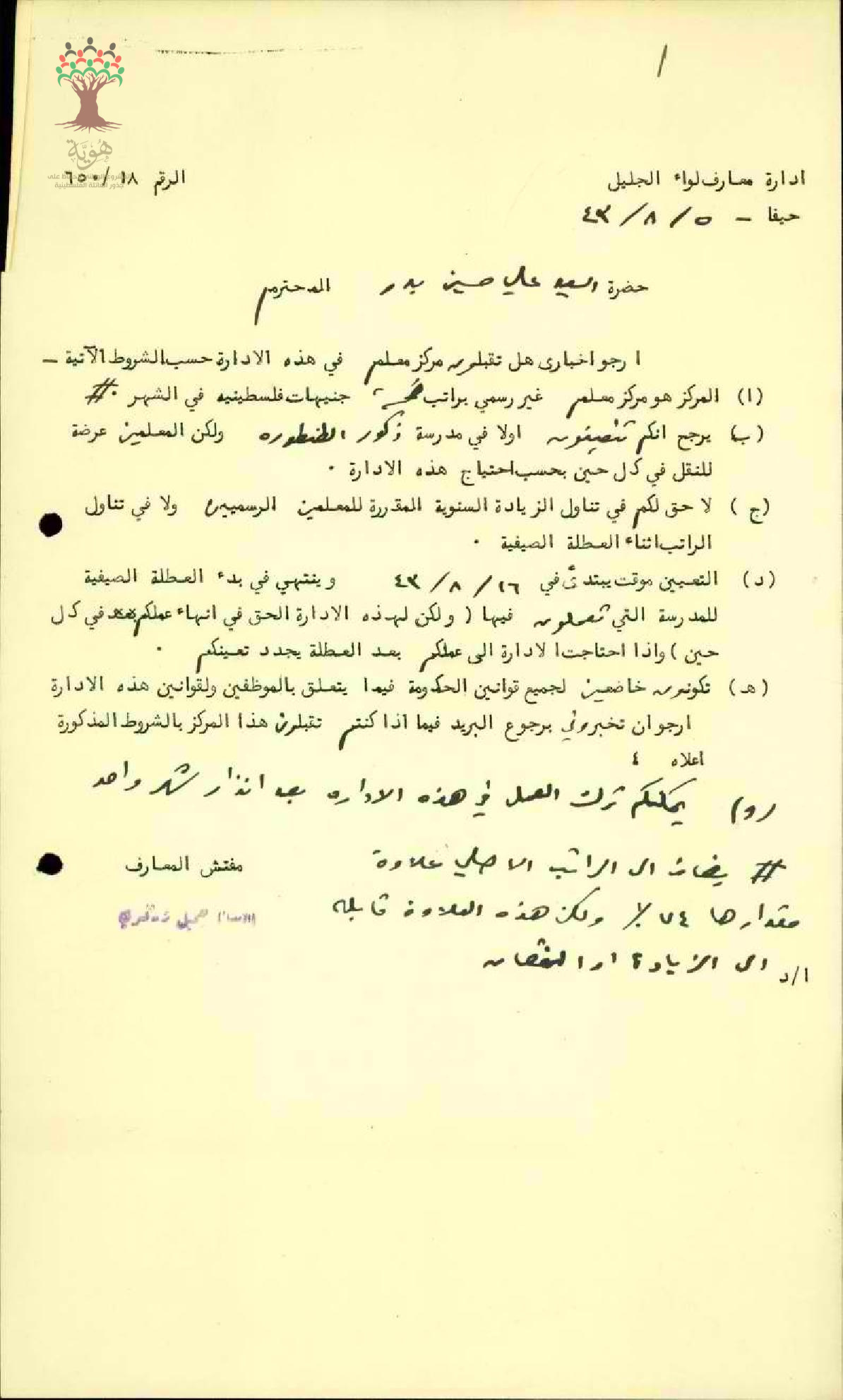 رسالة من مفتش المعارف إلى المعلم علي بدر يطلب اخباره بقبول مركز معلم في الإدارة