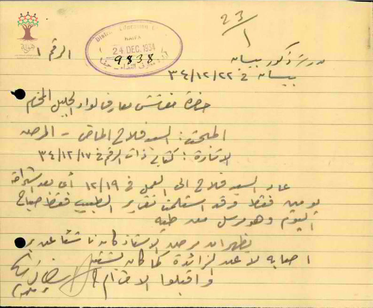 رسالة من مدير مدرسة بيسان الى مفتش المعارف يخبره بمرض المعلم فلاح الماضي
