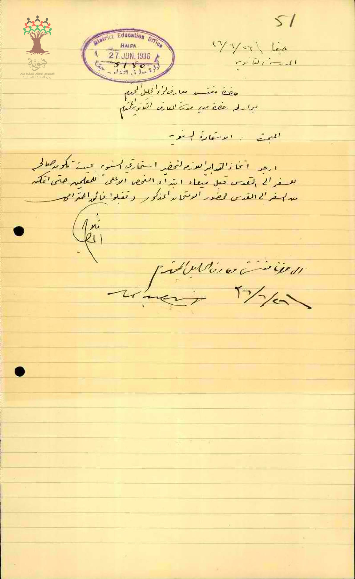 رسالة من المعلم فلاح الماضي الى مفتش المعارف بخصوص استمارته السنوية