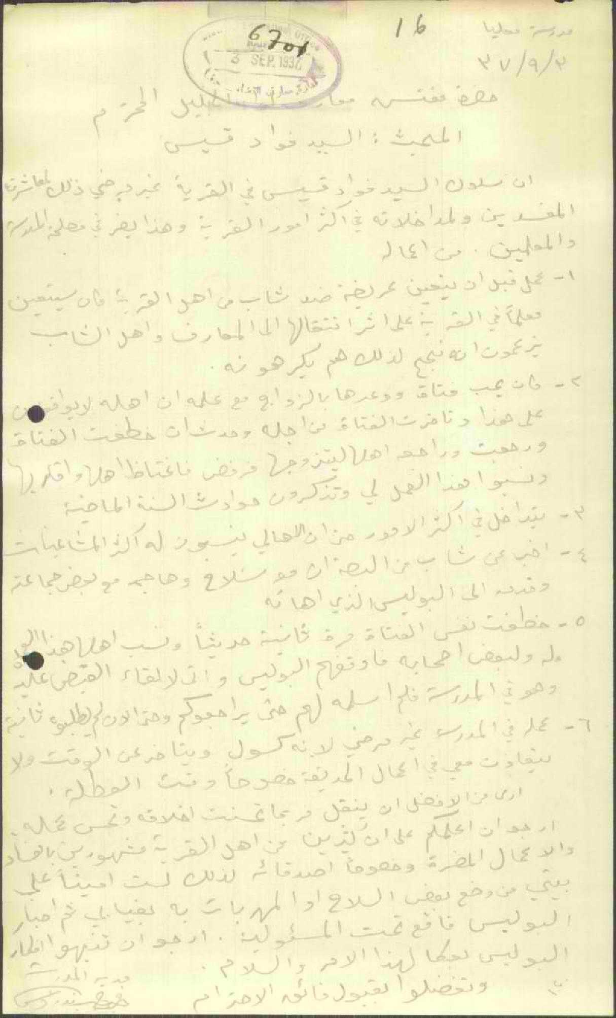 رسالة من مدير مدرسة معليا إلى مدير المعارف بخصوص المعلم فؤاد قسيس بخصوص سلوكه الغير مرضي عنه
