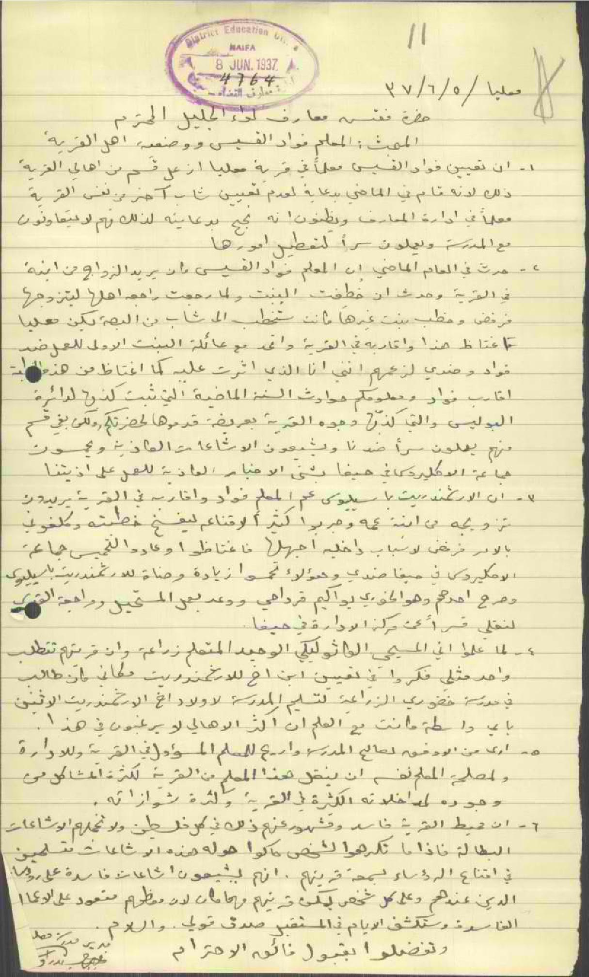رسالة من مدير مدرسة معليا إلى مفنش المعارف بخصوص تعيين المعلم فؤادقسيس أزعج بعض أهالي القرية