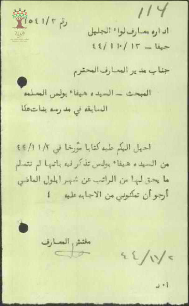 رساله من مفتش المعارف الى مدير المعارف بخصوص المعلمه هيفاء بواس بخصوص الراتب الذي لم تستلمه في شهر ايلول الماضي