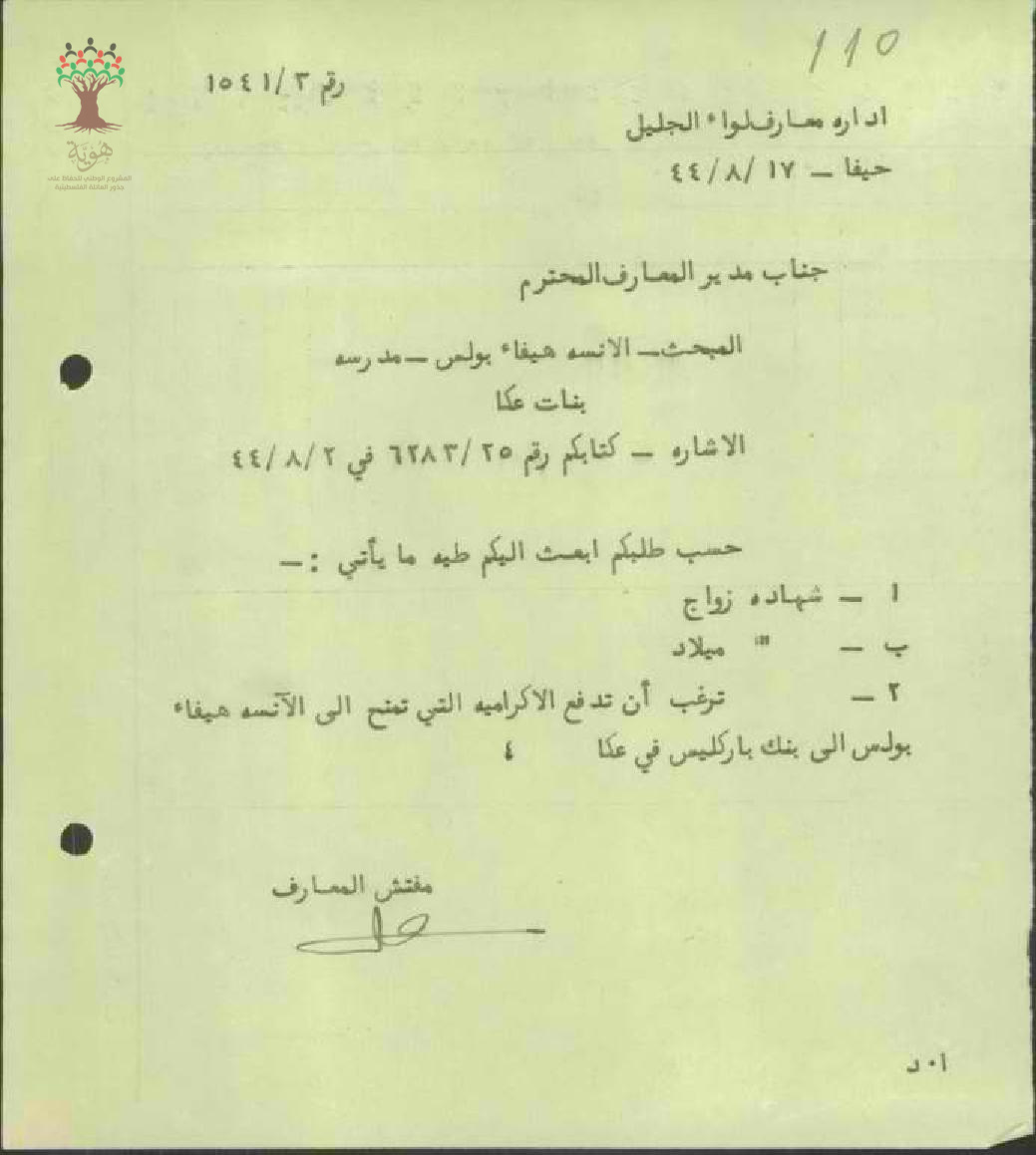رساله من مفتش المعارف الى مدير المعارف بخصوص طيه شهاده زواج المعلمة هيفاء بولس