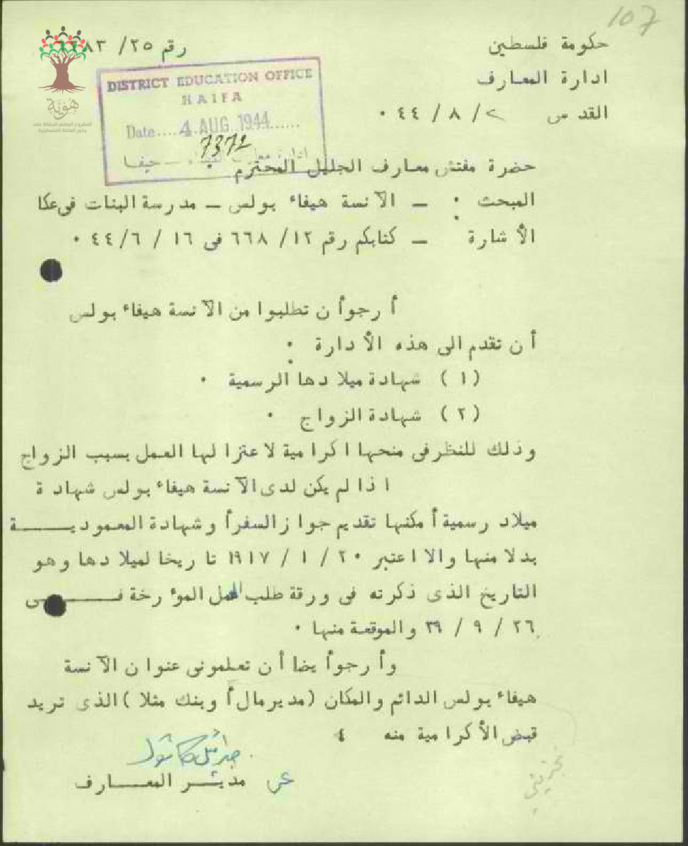 رساله من مدير المعارف الى مفتش معارف الجليل بخصوص المعلمه هيفاء بولس وتقديم شهاده ميلادها الرسميه وشهاده الزواج وفي ذلك للنظر في منحها اكراميه
