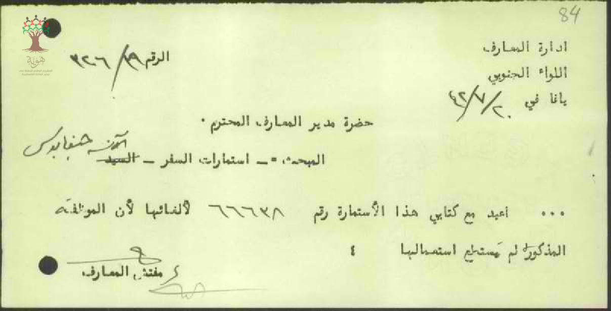 رساله من مفتش المعارف الى مدير المعارف بخصوص استمارت السفر الى المعلمه هيفاء بولس