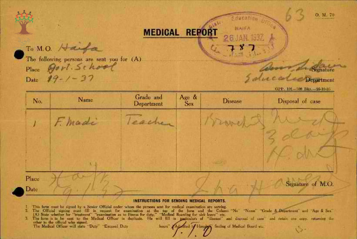 رسالة من مدير مدرسة حيفا الى مفتش المعارف بخصوص تغيب المعلم فلاح الماضي وعودته الى العمل مرفقة بالتقرير الطبي