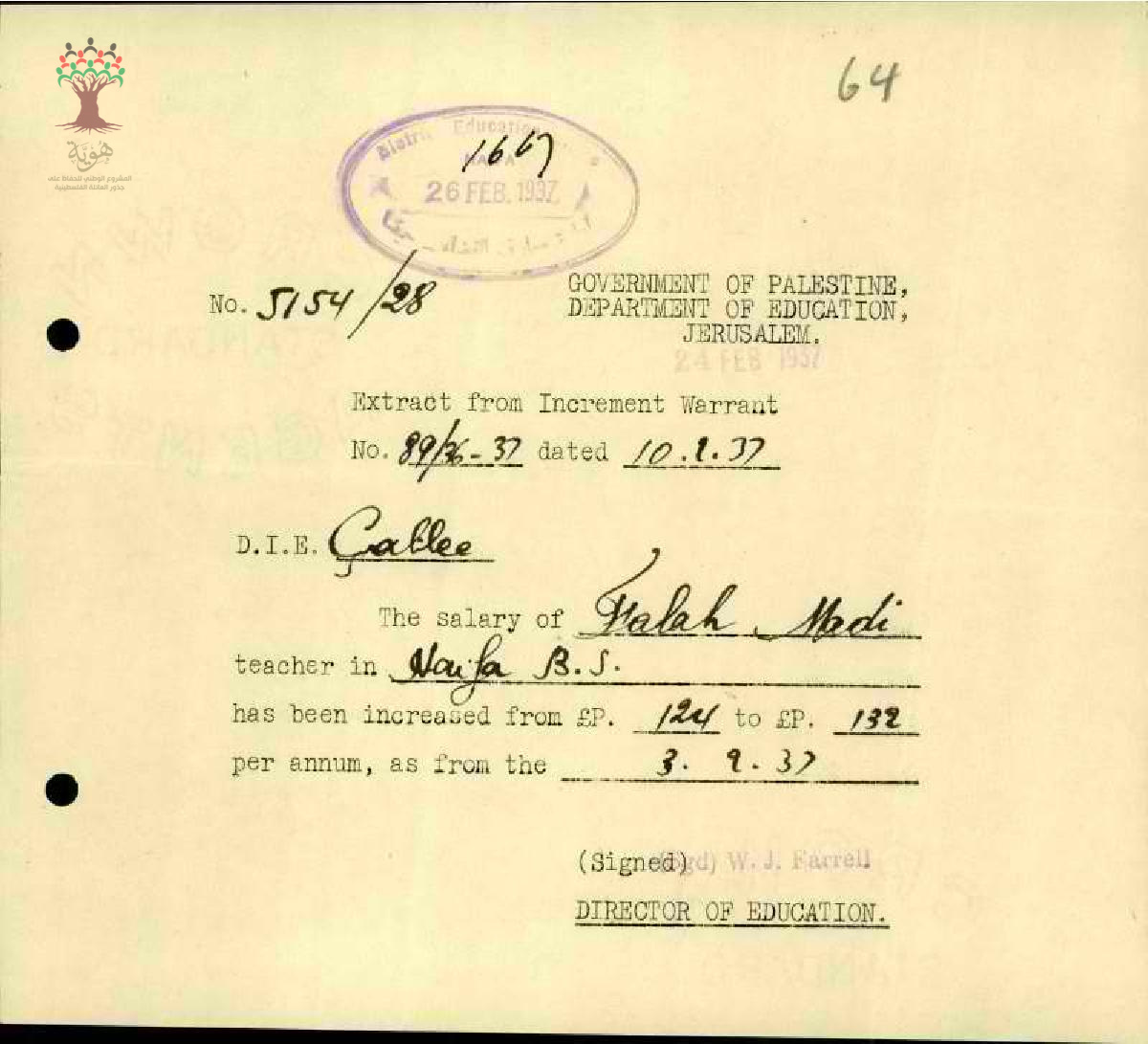 رسالة من مدير المعارف الى مفتش المعارف بخصوص زيادة راتب المعلم فلاح الماضي السنوية