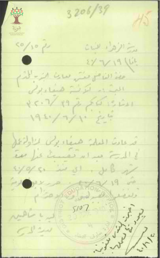 رسالة من مديرة مدرسة الزهراء للبنات إلى مفتش معارف الجنوب بخصوص عودة المعلمة هيفاء بولس إلى عملهل بعد غياب شهر كامل عن التدريس في المدرس