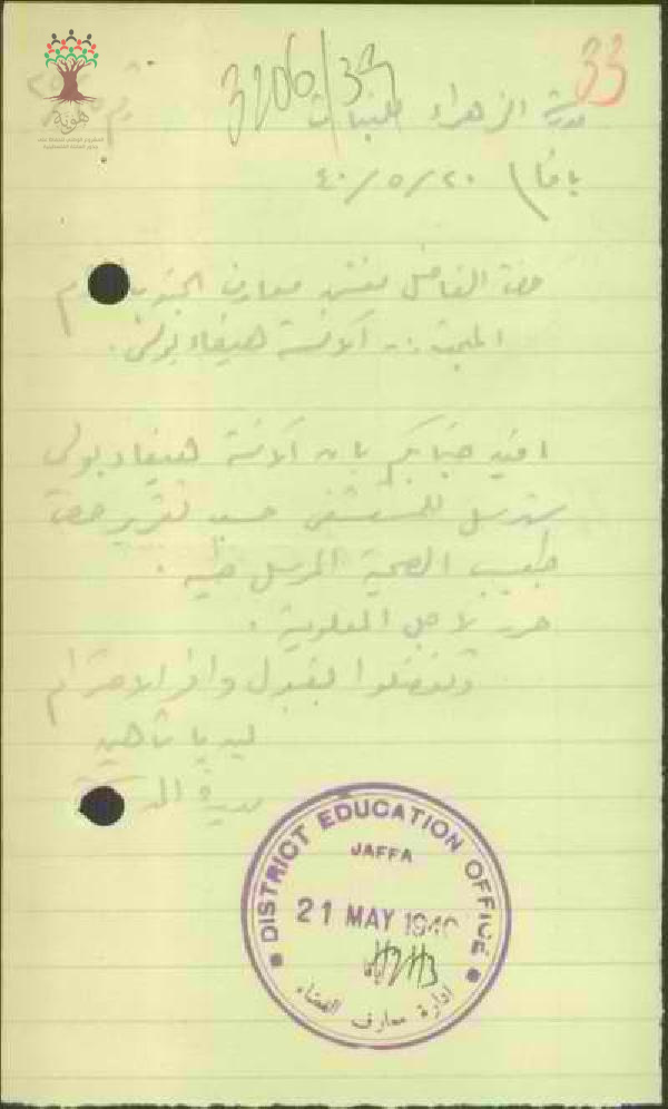 رسالة من مديرة مدرسة الزهراء للبنات مفتش معارف الجنوب بخصوص إعلامكم بدخول المعلمة هيفاء بولس إلى المشفى للمعالجة