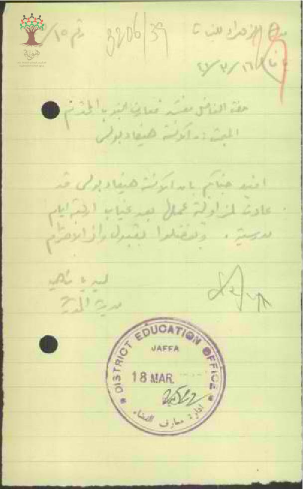 رسالة من مديرة مدرسة الزهراء للبنات إلى مفتش معارف الجنوب بخصوص بعودة المعلمة هيفاء بولس بعد غياب أربعة أيام