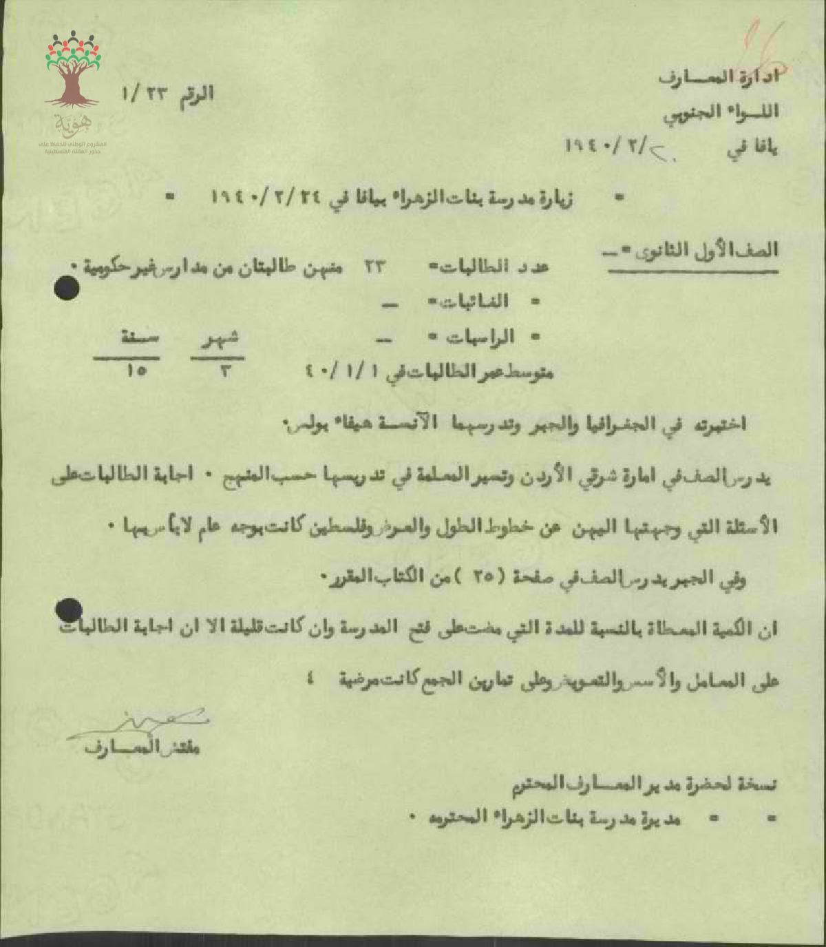 رسالة من مفتش المعارف إلى مديرة مدرسة الزهراء للبنات بخصوص زيارة المدرسة وأختبار تدريس المعلمة هيفاء بولس كانت جيدة