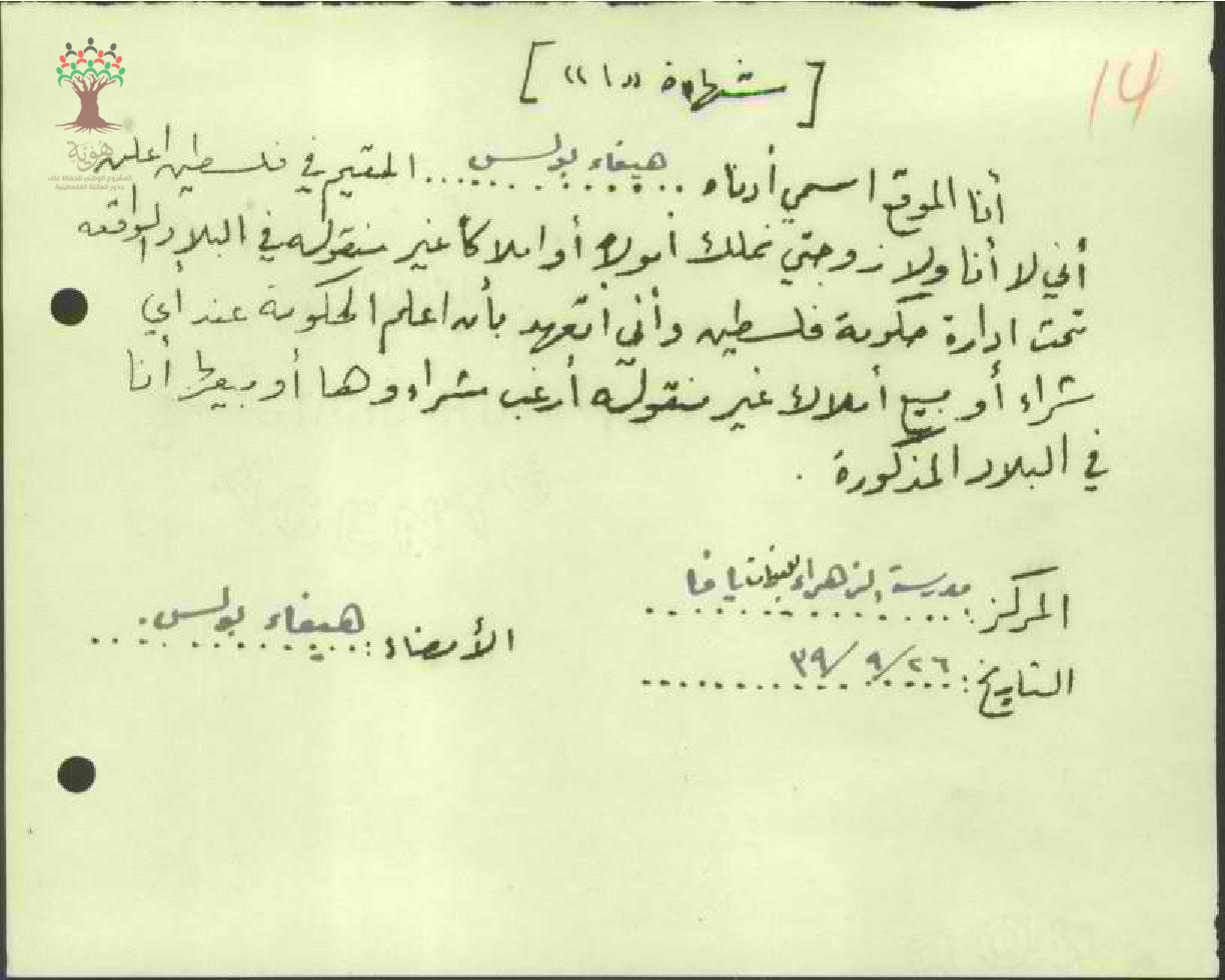 شهادة لحكومة فلسطين من المعلمة هيفاء بولس المقيمة في فلسطين بأنها لاتملك أملاك وأموال منقولة وغير منقولة