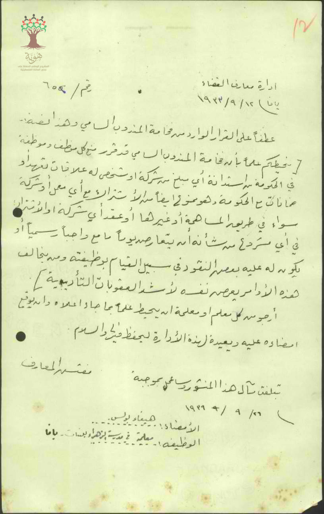 رسالة من مفتش المعارف إلى ادارة معارق القضاء بخصوص قرار المندوب السيامي بعد الدين من ـي شركة نسخة للمعلمة هيفاء بولس المدرسة في مدرسة الزهراء للبنات