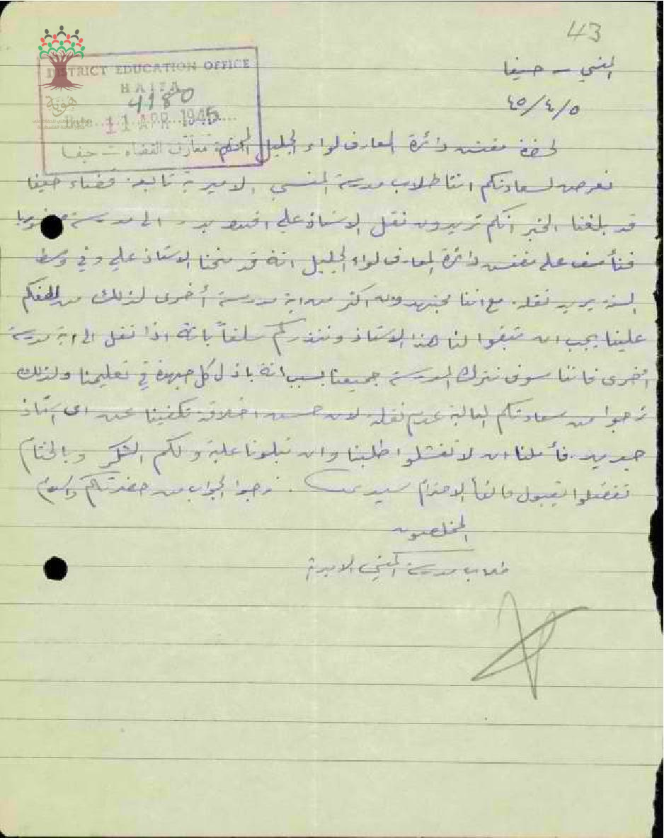 رسالة من طلاب مدرسة المنسي إلى مفتش المعارف بخصوص نقل المعلم علي بدر من المدرسة