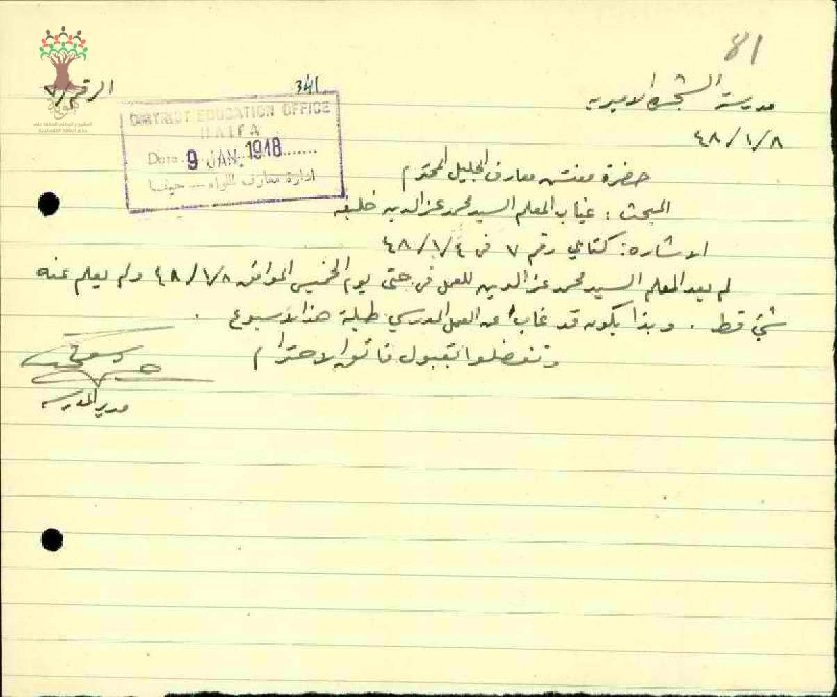 رسالة من مدير مدرسة الشجرة الأميرية إلى مفتش معارف لواء الجليل بخصوص غياب المعلم محمد عز الدين خليفة