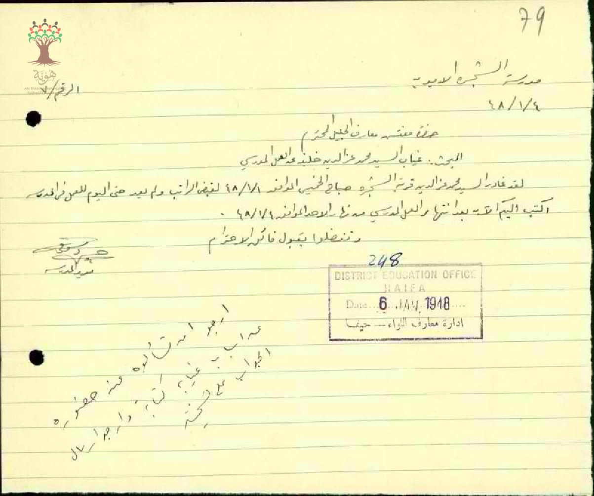 ساله من مدير مدرسه الشجرة الاميرية الى مفتش معارف الجليل بخصوص ذهاب المعلم محمد عز الدين ليستلم راتبه ولم يعد الى عملها في المدرسه