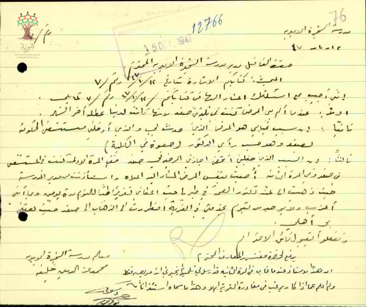 رساله من المعلم محمد عز الدين خليفة الى مدير مدرسه الشجرة الاميرية ويتحدث فيها عن أسألت المدير له