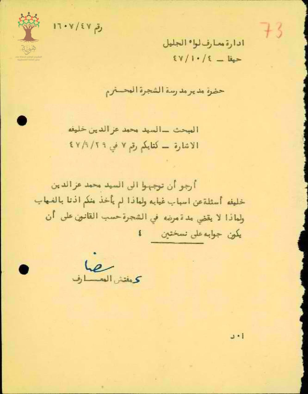 رساله من مفتش المعارف الى مدير مدرسه الشجرة الاميرية بخصوص اخبار المعلم محمد عز الدين عن سباب غيابة ولماذا لم ياخذ منكم اذنا بالغياب