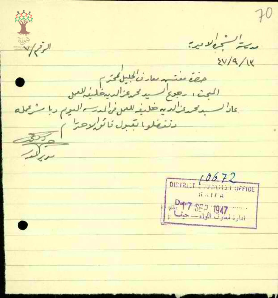 رساله من مدير مدرسه الشجرة الاميرية الى مفتش معارف الجليل بخصوص رجوع المعلم محمد عز الدين خليفة للعمل في المدرسه وباشر عمله