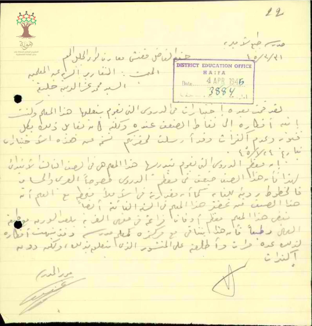 رسالة من مدير مدرسة جبع إلى مفتش المعارف بخصوص تقرير سري عن المعلم محمد عز الدين خليفة تم أختبار له وتنبيهه ولاكن كان قليل التفاعل والأهتمام