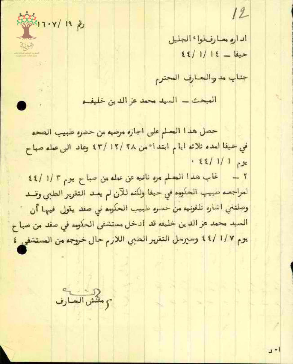 رسالة من مفتش المعارف إلى جناب مدير المعارف بخصوص إجازة مرضية مدتها ثلاثة أيام للمعلم محمد عز الدين خليفه بسبب مرضه