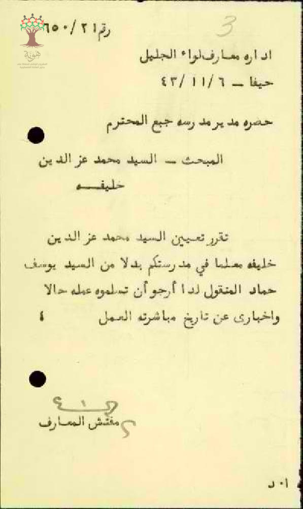 رسالة من مفتش المعارف إلى مدير مدرسة جبع بخصوص تعين محمد عز الدين خليفة مدرسا في مدرستكم