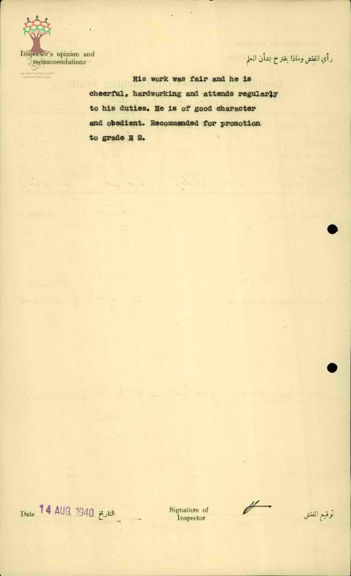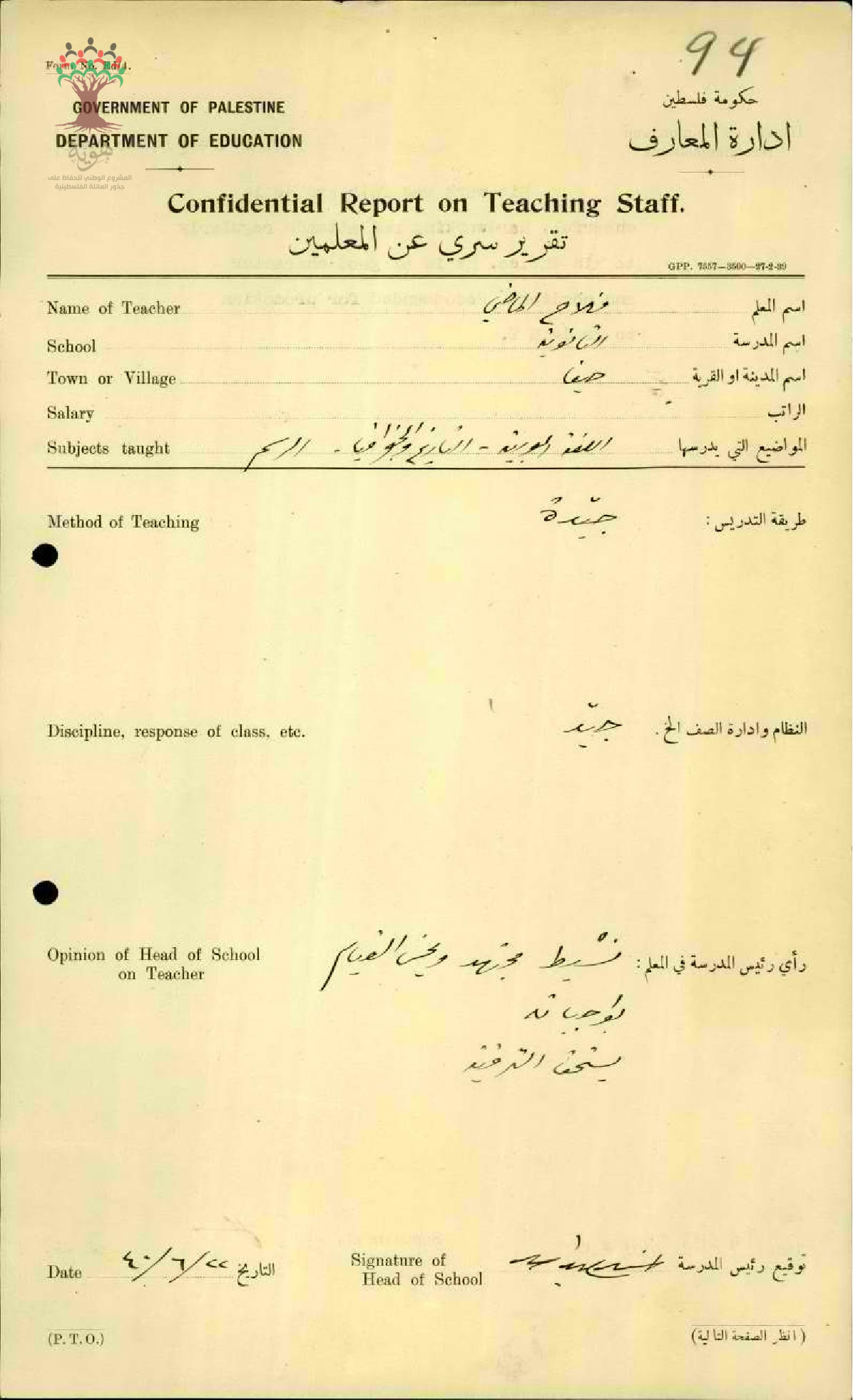تقرير تفصيلي عن أداء المعلم فلاح الماضي في مدرسة حيفا سنة 1940